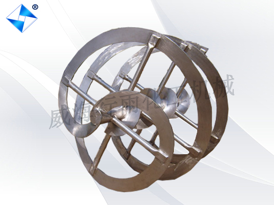 螺帶式攪拌器是一種軸流式攪拌器。其結(jié)構(gòu)形式有單螺帶和雙螺帶兩種。雙螺帶的兩帶螺旋方向相同,相角相差180°。使用螺帶式攪拌器可使攪拌范圍為整個攪拌槽橫截面。流體在螺帶式攪拌器作用下,沿槽壁的流體在螺帶的推動下向動,而在攪拌軸附近的流體向下流動。這種攪拌器同推進(jìn)式攪拌器相似,對流體有較好的對流循環(huán)作用,但不能產(chǎn)生較大的剪切力。與推進(jìn)式攪拌器不同的是,它是一種慢速型攪拌器。這是因為為了增大攪拌作用范圍,其直徑要比推進(jìn)式攪拌大得多。從而同錨式一樣,為了不至于使得需要很大的攪拌功率,其轉(zhuǎn)速一般限制在50r/min左右。